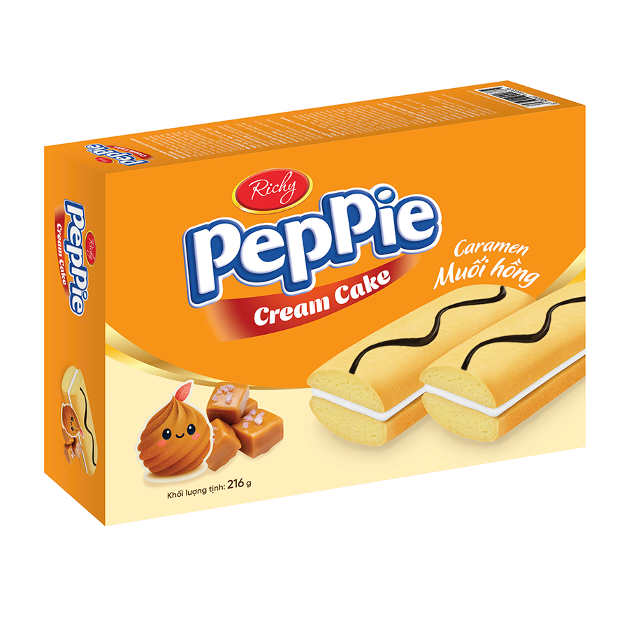 – Bánh Peppie vị  caramen muối hồng có kết cấu bánh mềm và xốp hơn, nhân kem mịn và mềm tan, ít ngọt và thanh vị. vị caramen quyện cùng chút muối hồng đậm vị thơm nồng nàn một chút khói nhẹ, ấn tượng ngay từ lần đầu thưởng thức