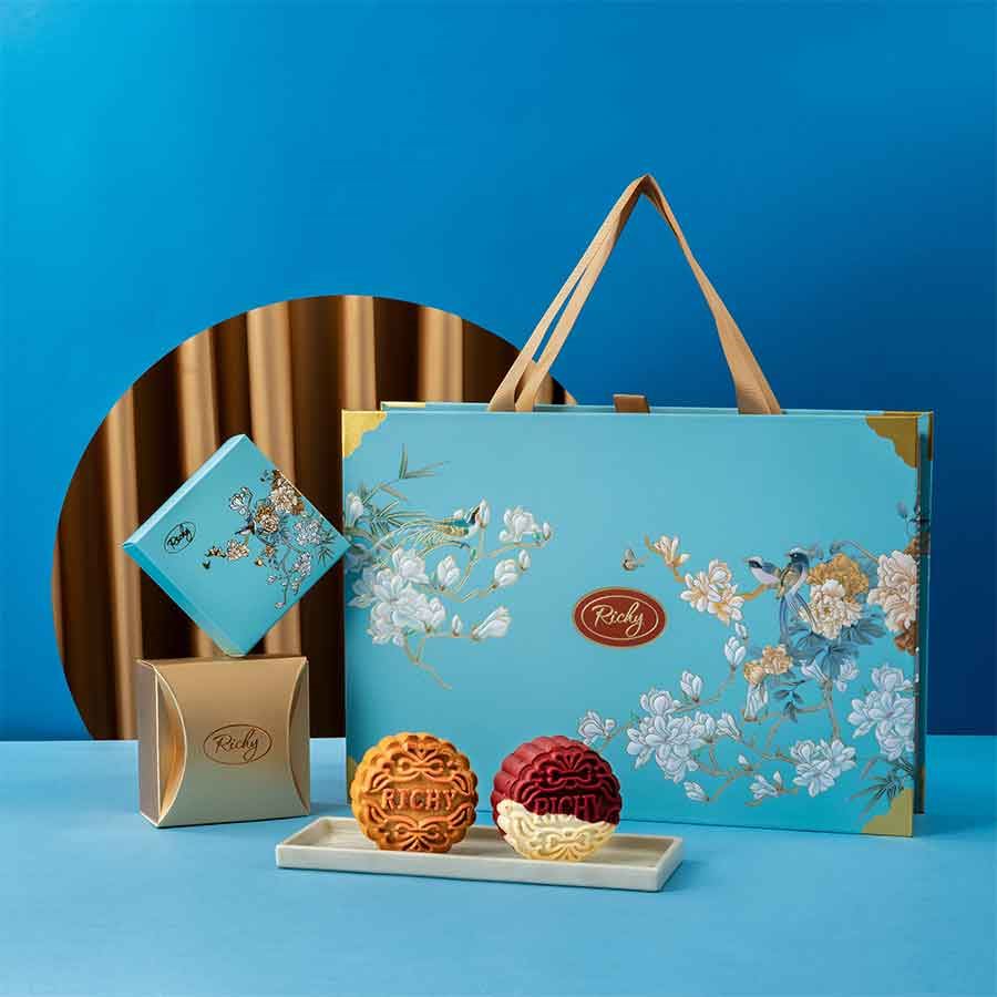 Thiết kế bao bì sang trọng: Hộp quà Bánh Trung Thu Richy 2025 Thu Vũ được thiết kế với tông màu xanh thanh khiết, họa tiết truyền thống tinh tế, tạo nên vẻ đẹp sang trọng và ý nghĩa thịnh vượng. Bao bì chắc chắn, thuận tiện cho việc bảo quản và làm quà biếu đặc biệt cao cấp.