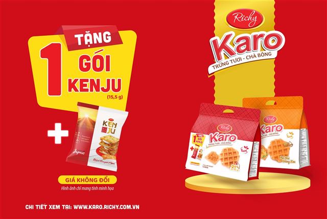 Richy tung chương trình ưu đãi lớn nhằm tri ân các khách hàng – tặng thêm 1 gói Kenju Nougat kem dẻo/ Kenju rau củ trong mỗi túi bánh Karo phô mai hoàng kim và Karo sợi gà với mức giá không đổi.